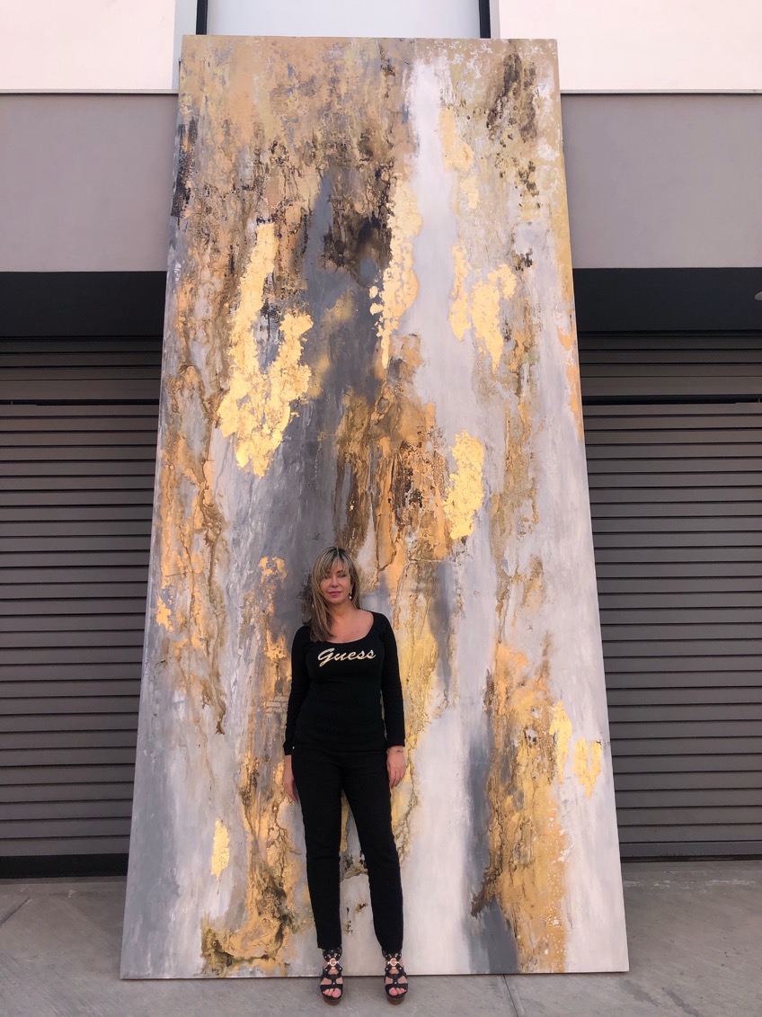 Obra abstracta en tonos neutros con dorado y plateado, llena de texturas.